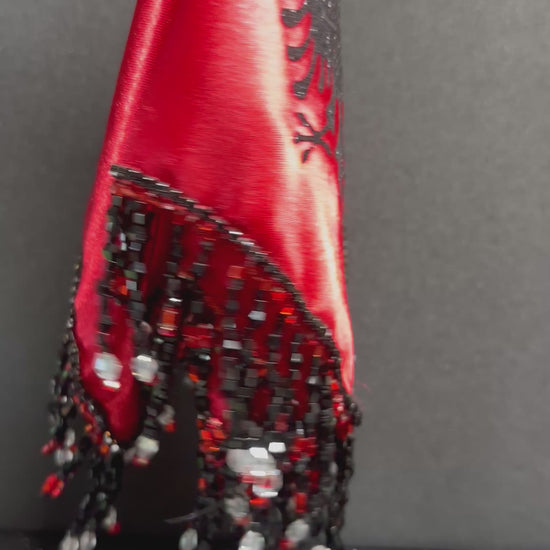 A bold red satin Shamia/Mindil featuring the iconic black glitter double-headed eagle, finished with hand-beaded rhinestone and crystal fringe. Perfect for weddings, cultural events, or displaying heritage with pride!