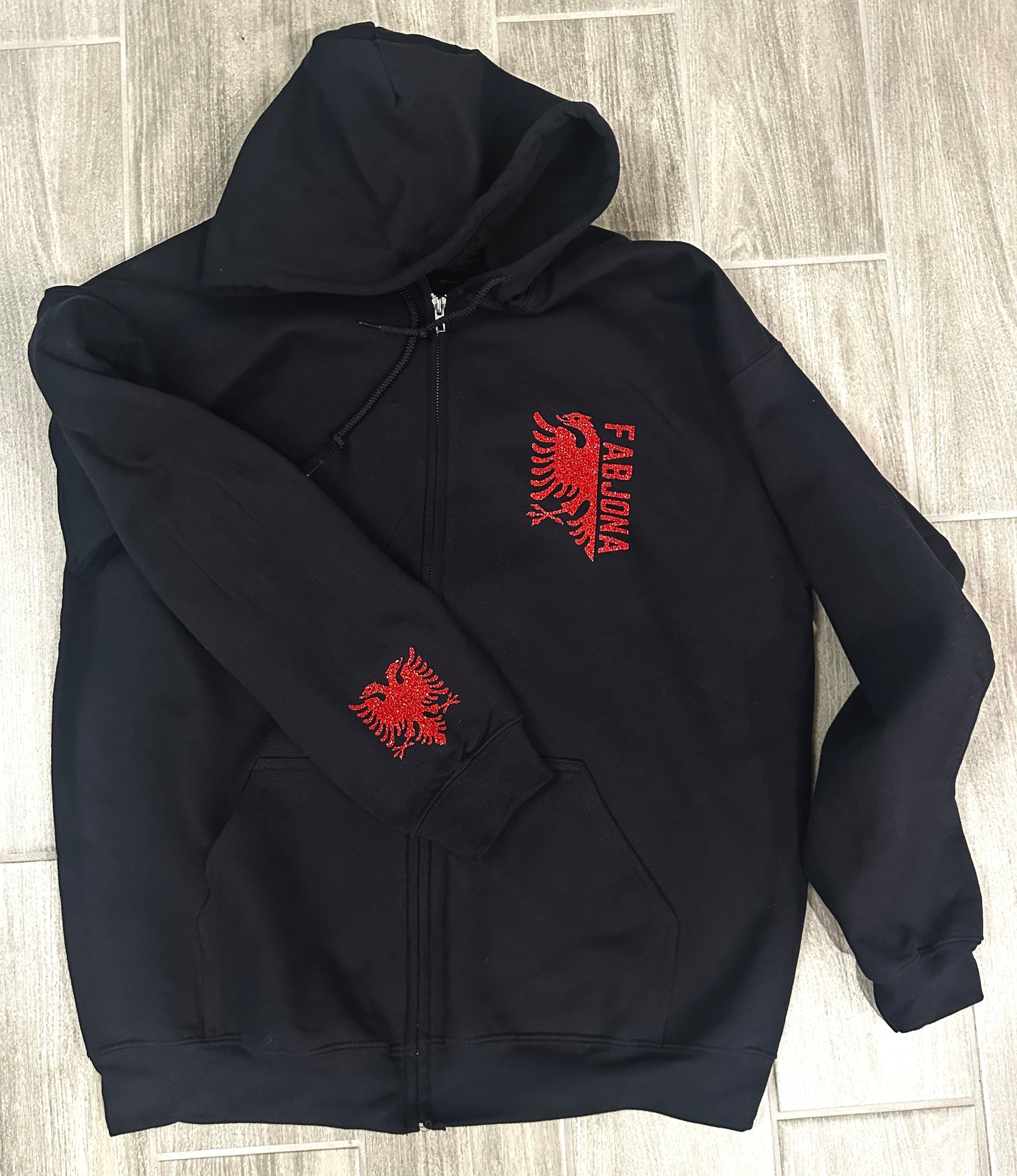 This personalized zip-up jacket features your name elegantly integrated on one half of the eagle design, offering a unique and custom touch. The back showcases a detailed Skenderbeg Albanian eagle graphic, symbolizing heritage and strength. Crafted for those who value both style and cultural significance, this jacket blends personalization with meaningful design for a distinctive look.